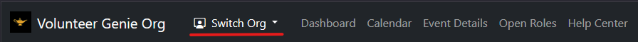 The organization switcher in your navigation bar lets you quickly change which organization you're currently working with, so you can access the right events, volunteers, and settings without logging out and back in.